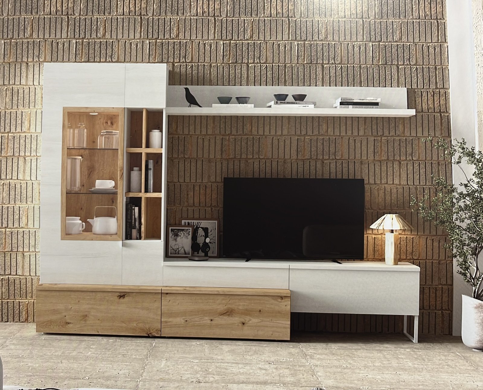 Composicion de salón elegante y moderna de 270 cms von vitrina, bajo Tv y estantes. 270 cms. Artisan/Polar