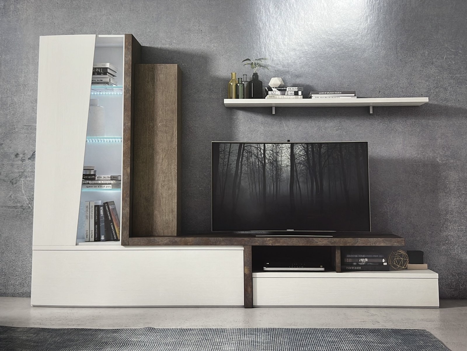 Moderna composición con luces led en bodeguero con alto de una puerta, estante de 140 bajo con un cajon y otro con puerta abatible. Blanco/Óxido/Perkin. 265 cms